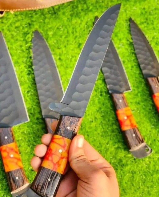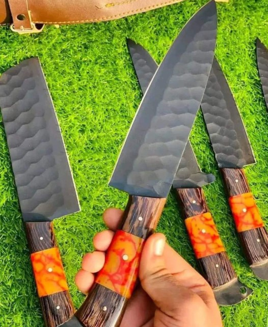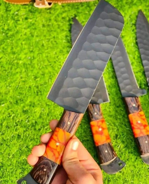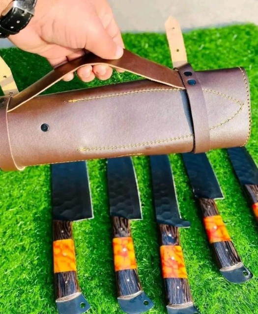 Custom Handmade D2 Steel Kitchen Knives Set With Pure Leather Rool Kit For Sale.