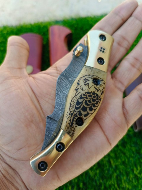 Custom Handmade Damascus Steel Pocket Knife With Pure Leather Sheath For Sale.