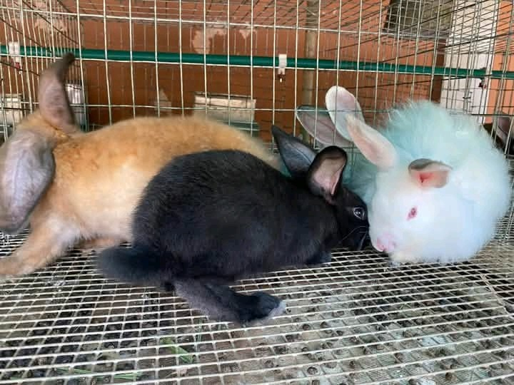 The rabbits vary in color and sizes with a mix of playful and calm behavior