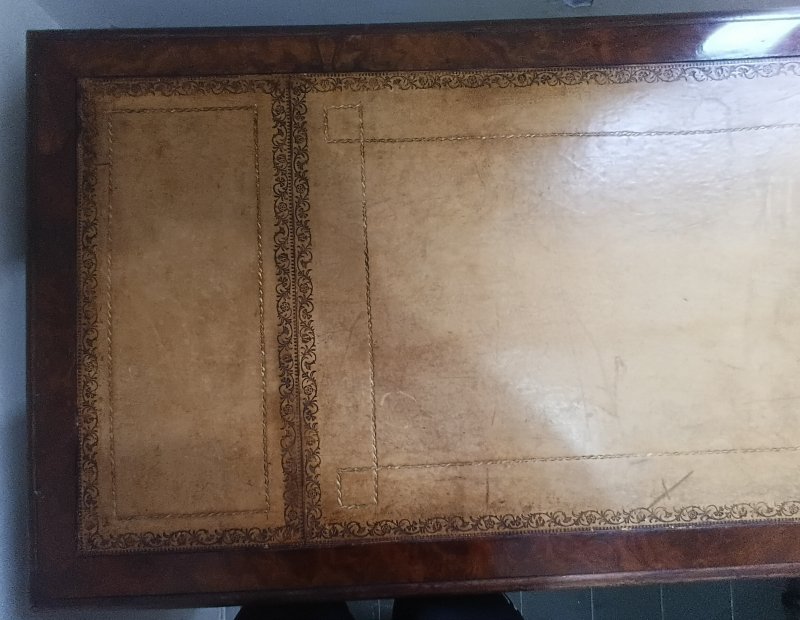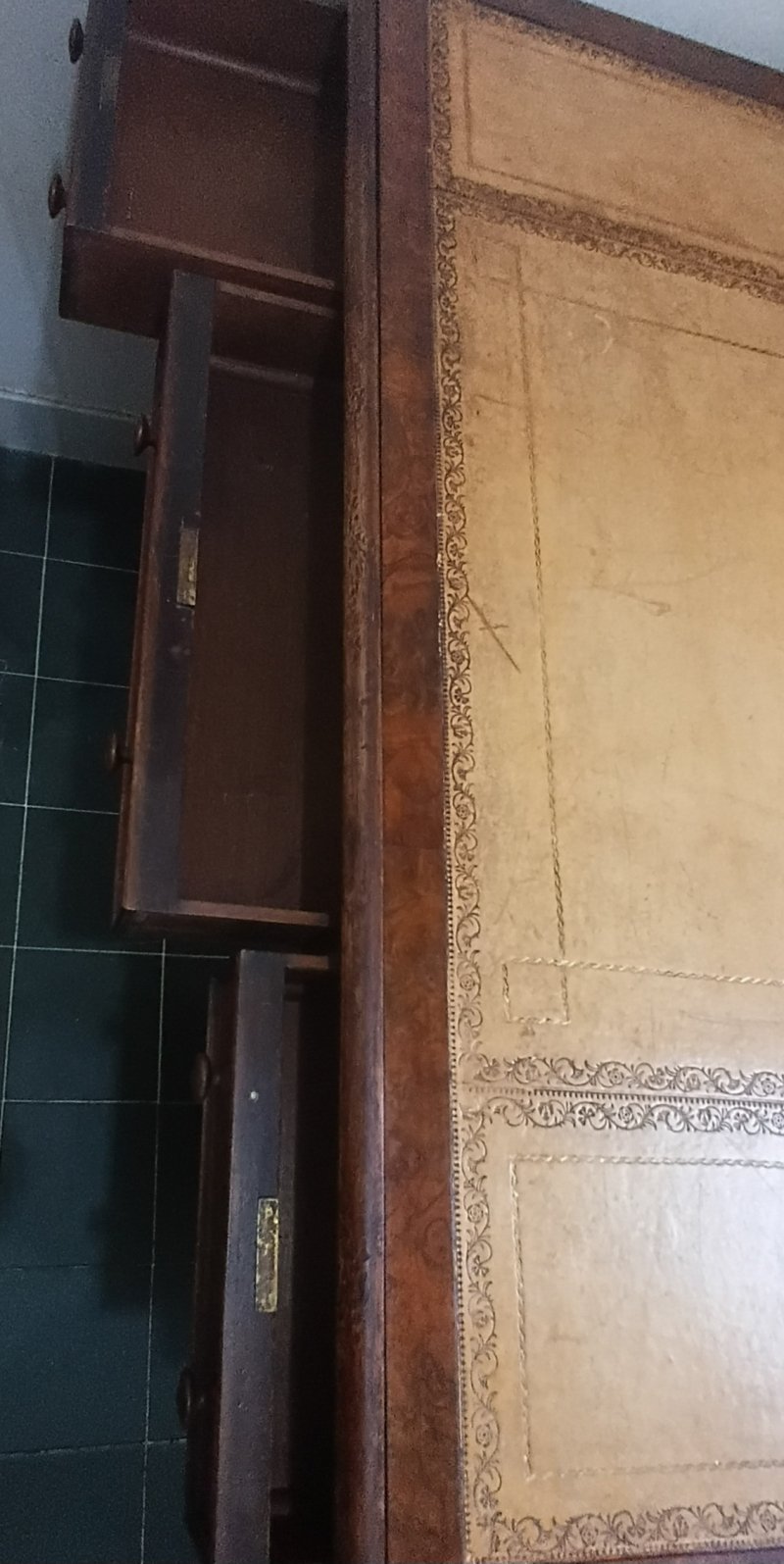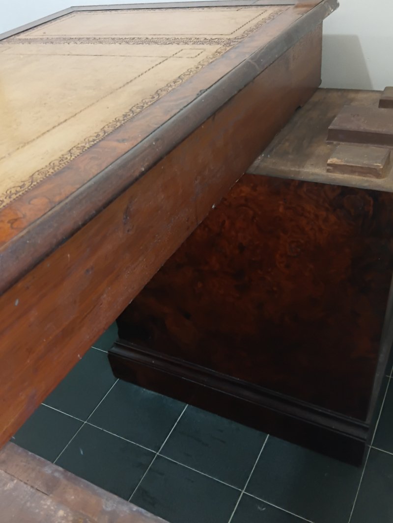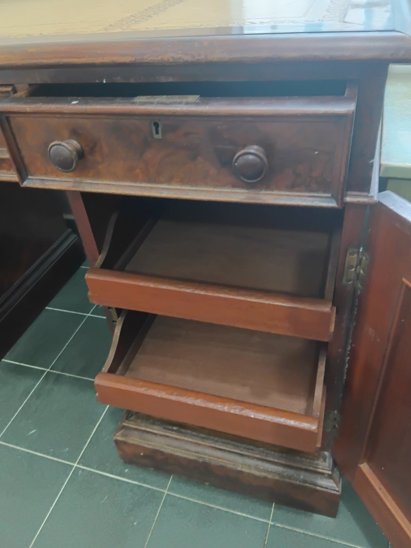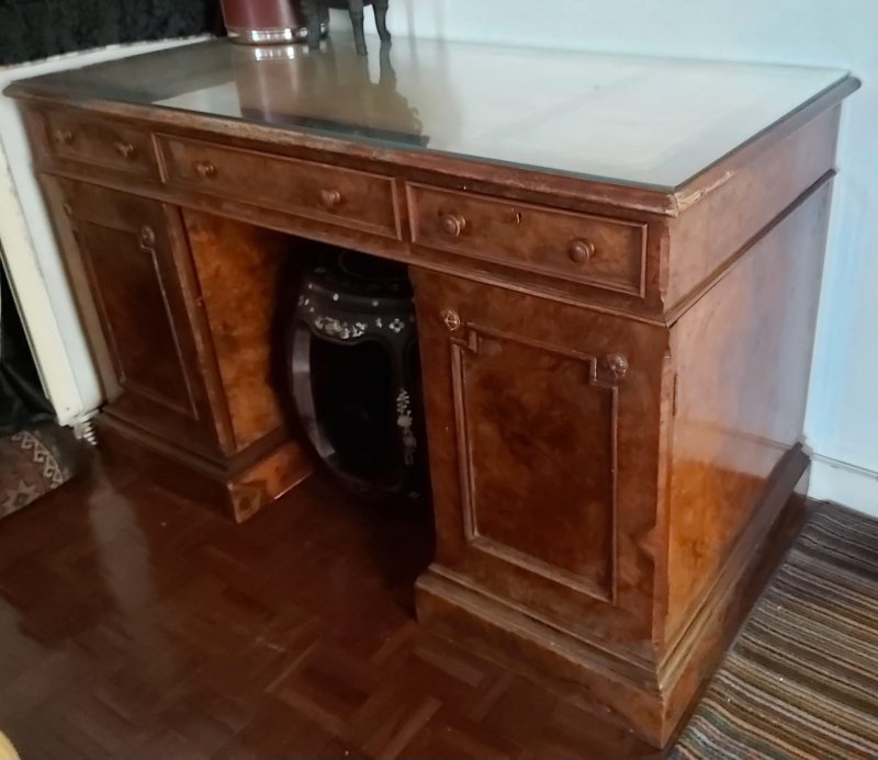 This fine example of Victorian furniture was bought in Farnham, Surrey, England in about 1975. It came to Hong Kong in 1981 and has been in good care to this day. Testament to the craftsmanship in such furniture, it has been in regular use, while the top, inlaid leather surface has been protected in glass. There are three top drawers and in the two side cupboards, two internal drawers and one shelf respectively,