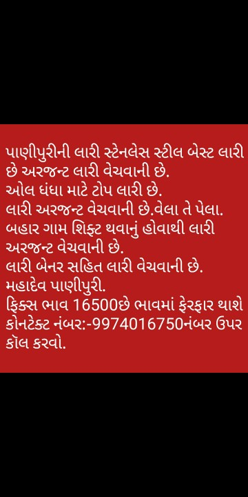 પાણીપુરીની લારી અરજન્ટ લારી વેચવાની છે. ટીપ ટોપ કન્ડીશન બેસ્ટ લારી છે. વેલા તે પેલા .બેસ્ટ લારી છે. ફિક્સ ભાવ14000છે. સ્પેશ્યલ પાણીપુરીની લારી છે. અરજન્ટ લારી વેચવાની છે. મોબાઇલ નંબર:-9426630465નંબર ઉપર કોલ કરવો એડ્રેસ શ્રીજી નગર હાથસની રોડ ખોડીયાર ચોક સાવરકુંડલા જિલ્લો અમરેલી.