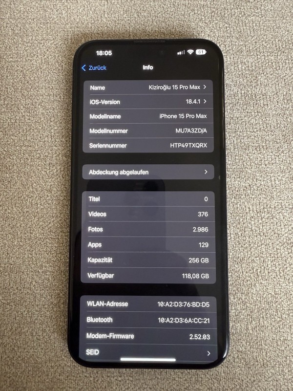 Das iPhone ist optisch neuwertig, da es seit Kauf in einer Quad Lock Hülle (siehe separate Auktion) und mit einem Panzerglas versehen war und es funktioniert einwandfrei. Batterie ist bei 98% und somit auch nahezu neu. Weitere Details siehe Fotos. (IMEI und Seriennummer sind auf den Fotos nur unkenntlich gemacht um Missbrauch vorzubeugen.)