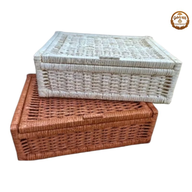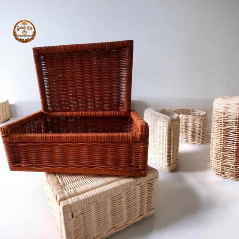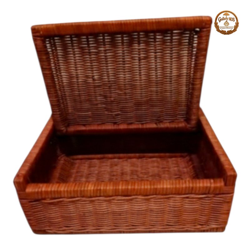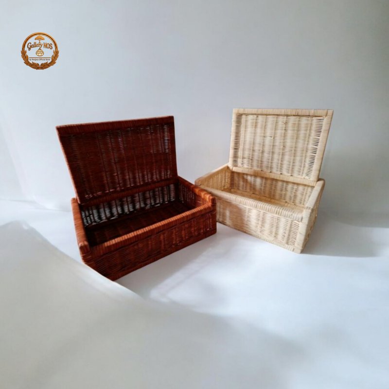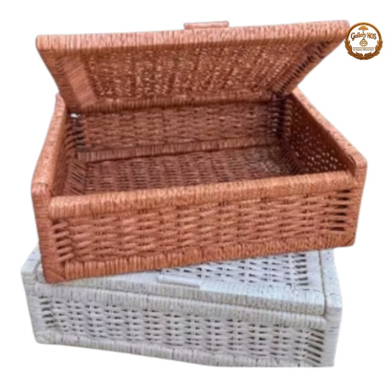 Keranjang rotan kotak dengan tutup, desain cantik, minimalis, Cocok digunakan untuk hampers, penyimpanan pakaian, mukena, handuk, souvenir, kado, hingga dekorasi ruangan.