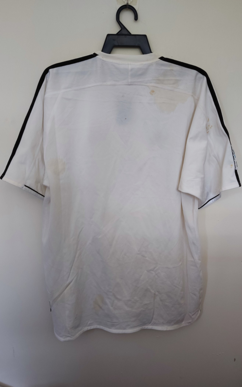 Obviously the shirt sponsor came off, stains at front and back due to storage issues, but free from torn, holes, pulls and flaws. The entire shirt is still in a very good shape except the stains and sponsors. PLEASE ASK FOR MORE PICTURES OF THE DEFECTED AREAS.