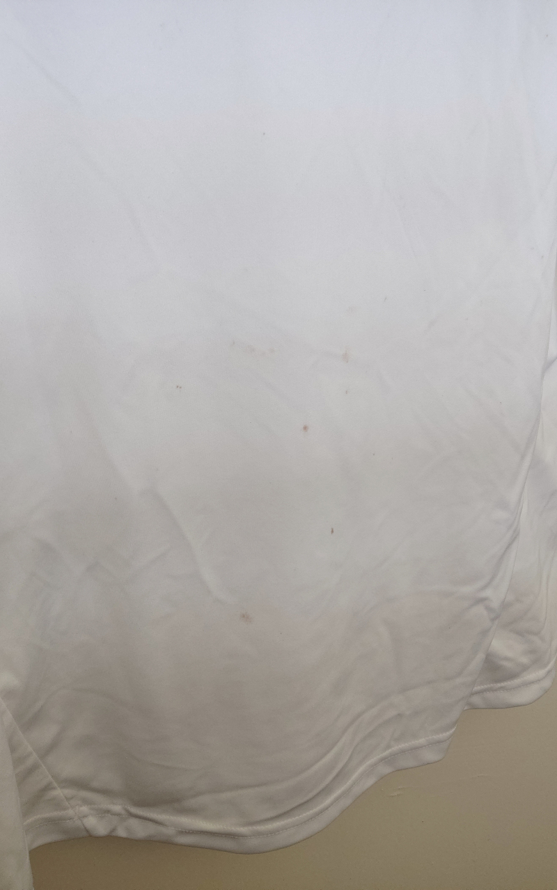 Badge missing obviously, dotted stains below at front and back, but eventually the entire shirt has no pulls no holes no discoloration no flaws. If you can fix it it'll be definitely perfect as new!