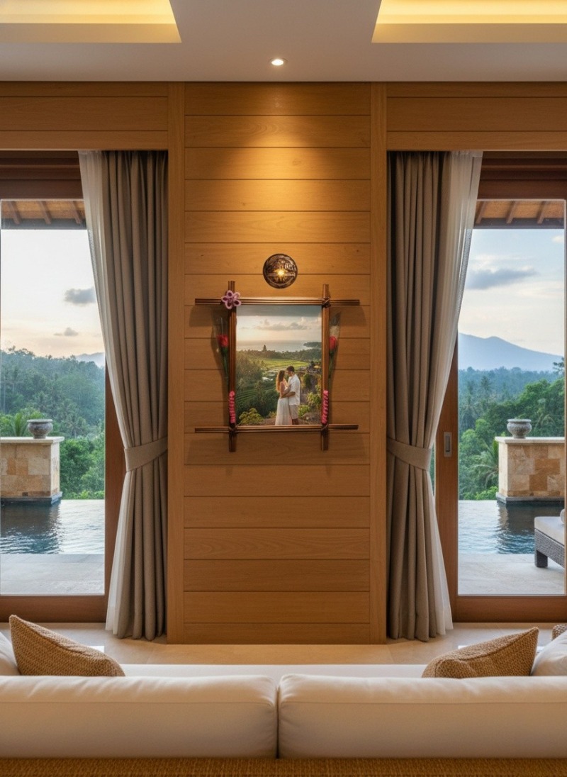 pigura ini tidak hanya menampilkan foto, tetapi juga memberi kesan tradisional, hangat, dan natural pada ruangan.
